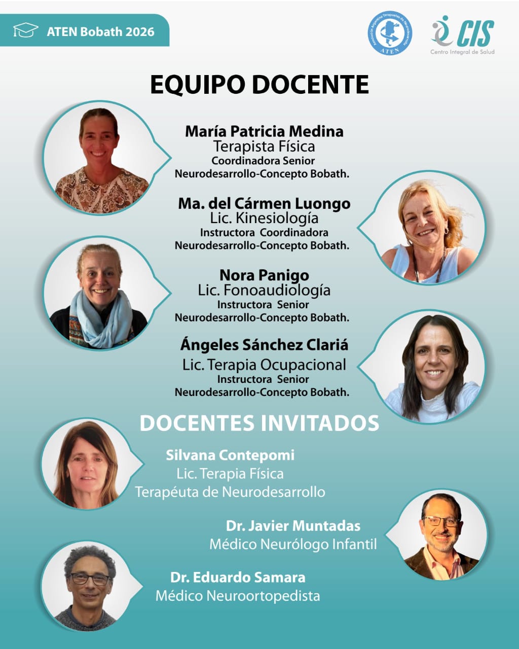 Disertantes: Lic. Patricia Medina, Terapista Fisica Coordinadora Instructora Senior TND. Lic. María Luongo, Kinesióloga, Coordinadora Instructora TND. Lic. Nora Panigo, Fonoaudióloga Instructora Senior TND; Lic. Ángeles Sánchez Clariá, Terapista Ocupacional, Instructora Senior TND.